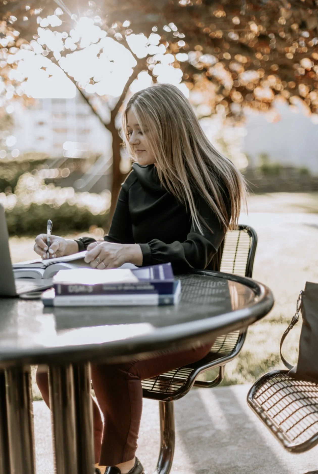 A woman with long light brown hair is sitting at an outdoor table, writing in a notebook. She is dressed in a black top and red pants, with books and a laptop in front of her. The background features a tree with orange leaves and a blurred outdoor setting.